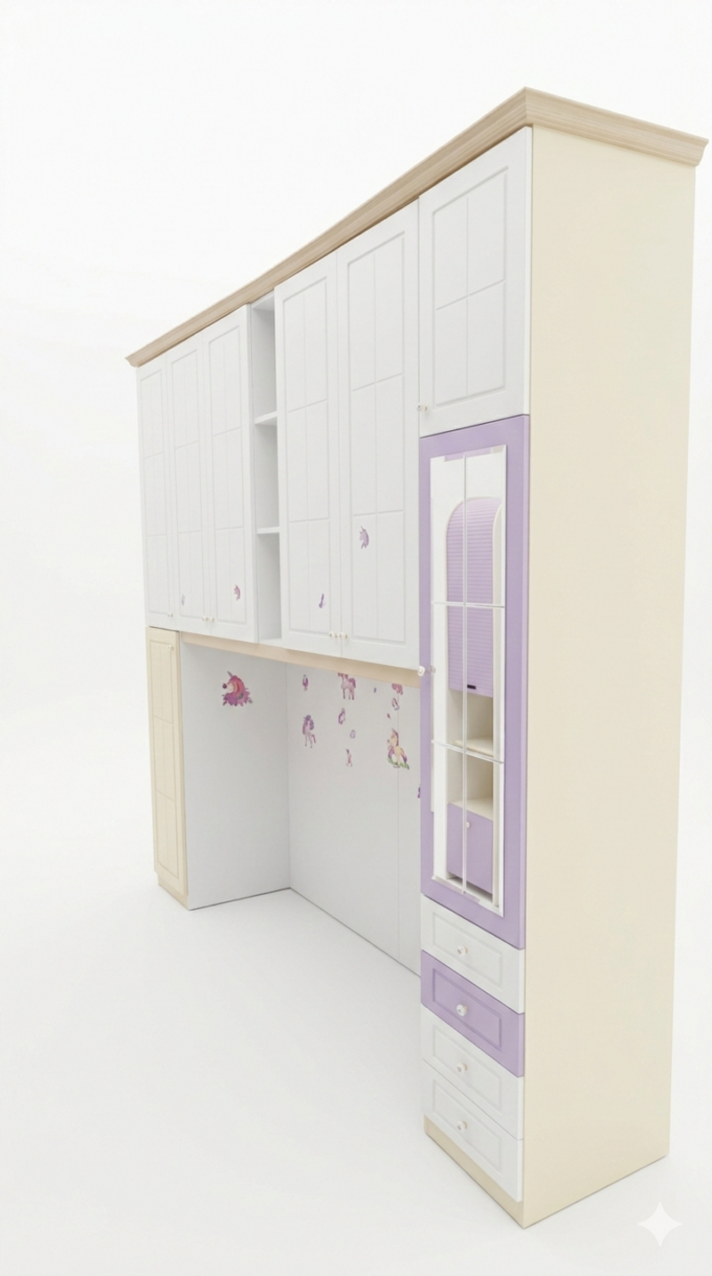 Dettagli Curati: Finitura lilla/lavanda sui cassetti e sulla cornice dello specchio, perfetta per un ambiente luminoso e accogliente.