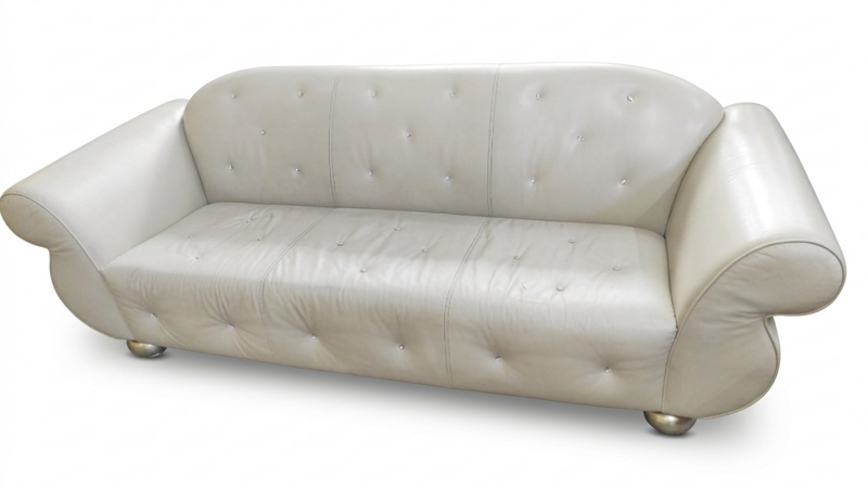 Dettagli di Pregio: Rivestimento in pelle bianca di alta qualità, impreziosito da bottoni decorativi tipo capitonné su schienale e base per un tocco di luce.
