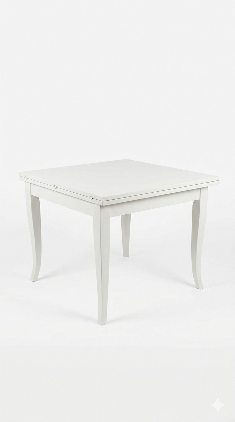 Vendo elegante tavolo quadrato allungabile, perfetto per cucina o soggiorno. Il tavolo unisce la praticità del sistema di apertura "a libro" a un design raffinato con gambe leggermente curve (a sciabola), tipiche dello stile classico o Shabby Chic.