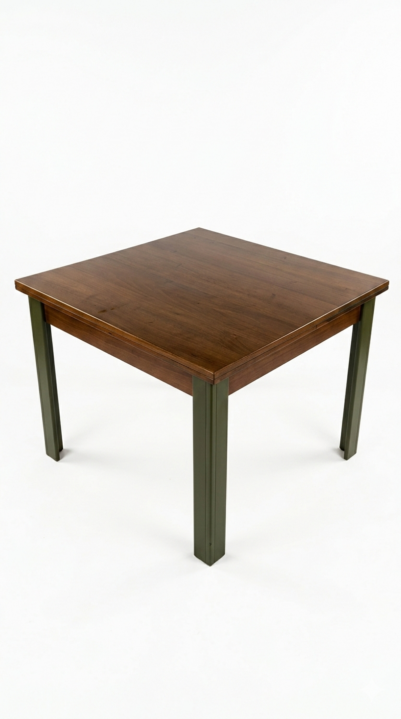 Struttura e Gambe: Realizzate in legno massiccio, verniciate in un raffinato verde salvia scuro/militare. La finitura opaca delle gambe crea un contrasto sofisticato con il calore del piano.
